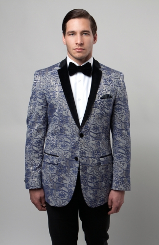 A beautiful blue leaf or traditional paisley pattern takes this Shawl Lapel Slim Jacket to the next level. Not only is the blue leaf pattern eye-catching and beautiful, it is enhanced with a contrasting smooth black lapel that will look great with a black bow tie and a crisp white shirt. A standout pattern is the perfect way to spice up a formal ensemble for something special.