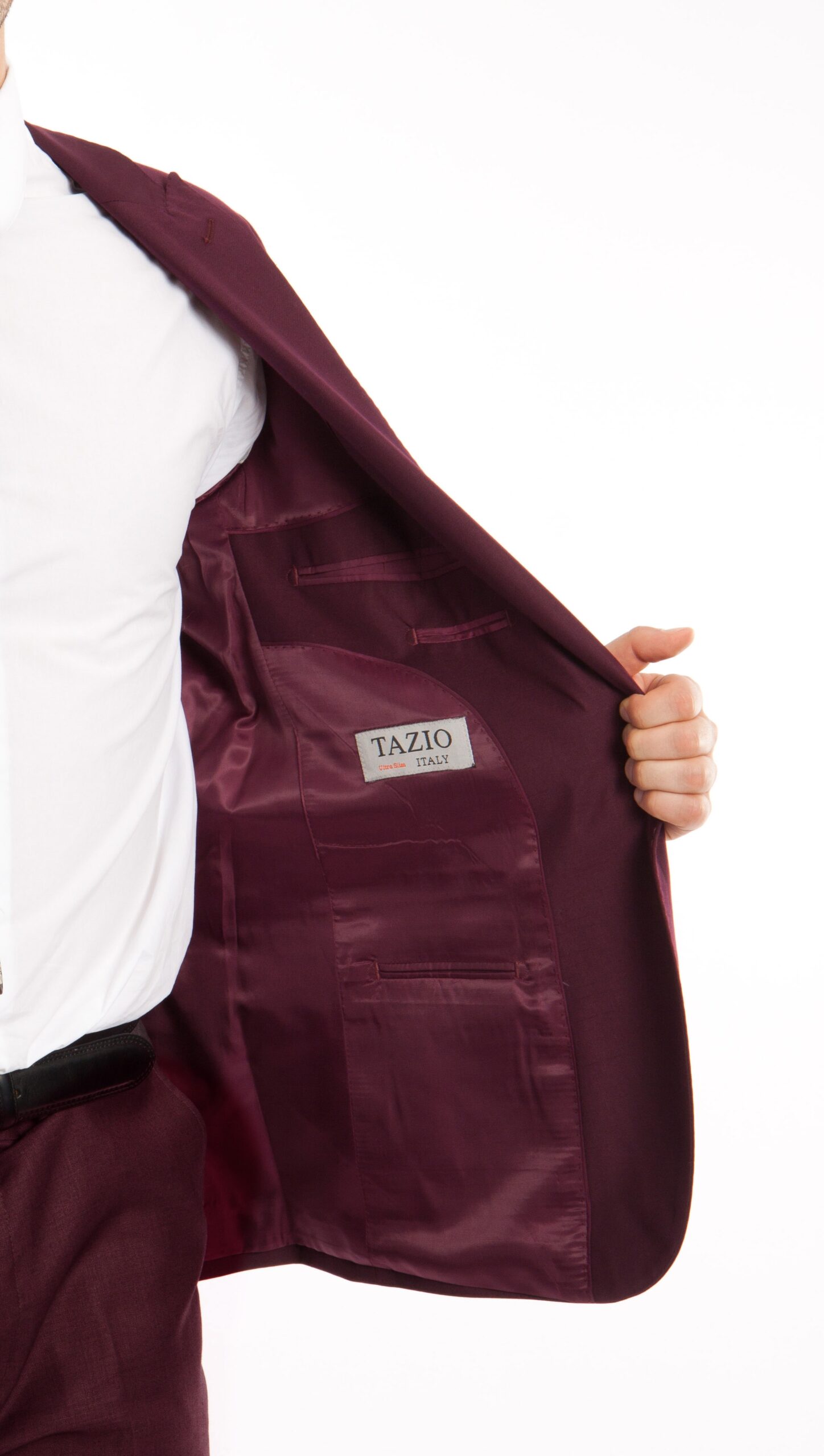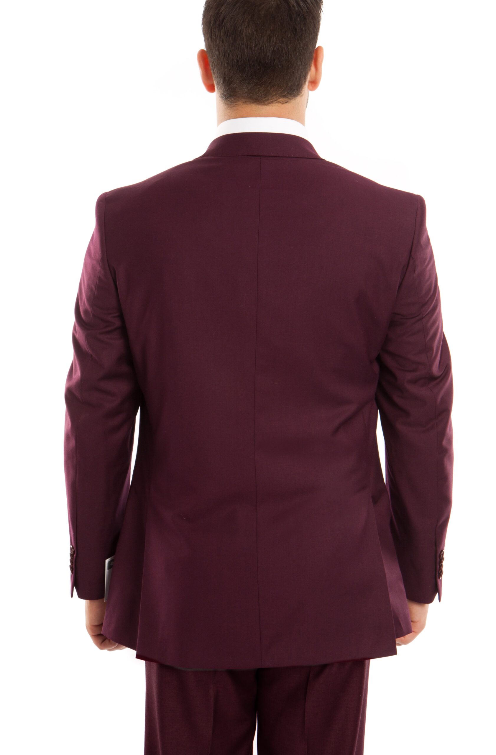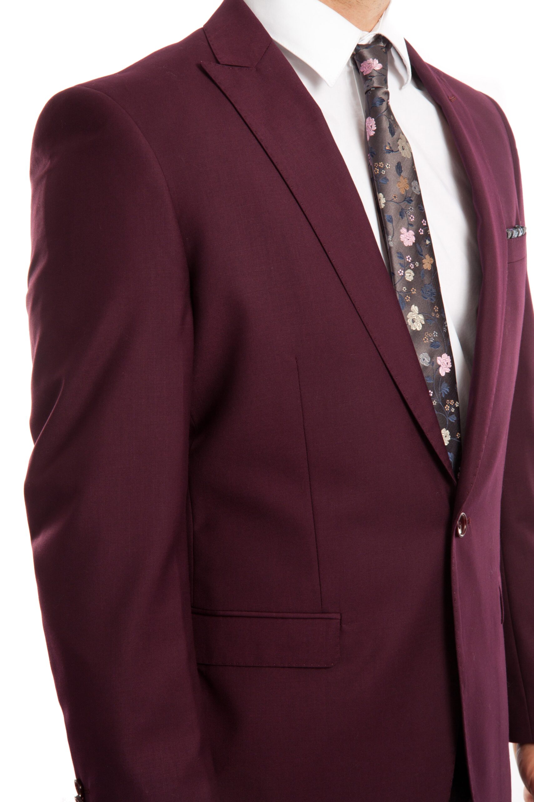 Flaunt this ultra slim fit suit of Burgundy color with a crisp white shirt, a coral tie, coral pocket square and a formal watch for those classic looks. The coral tie and pocket square contrast very well with the suit. Experiment this suit with different combination of shirts, ties and pocket square and be as fashionable as you can. The side vents ensure that you feel comfortable when you sit.
