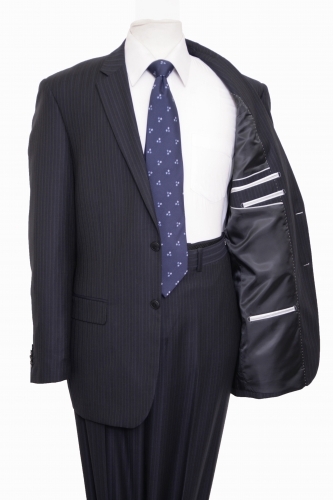 - Navy Pinstripe Wool Suit is single breasted with two button closures.