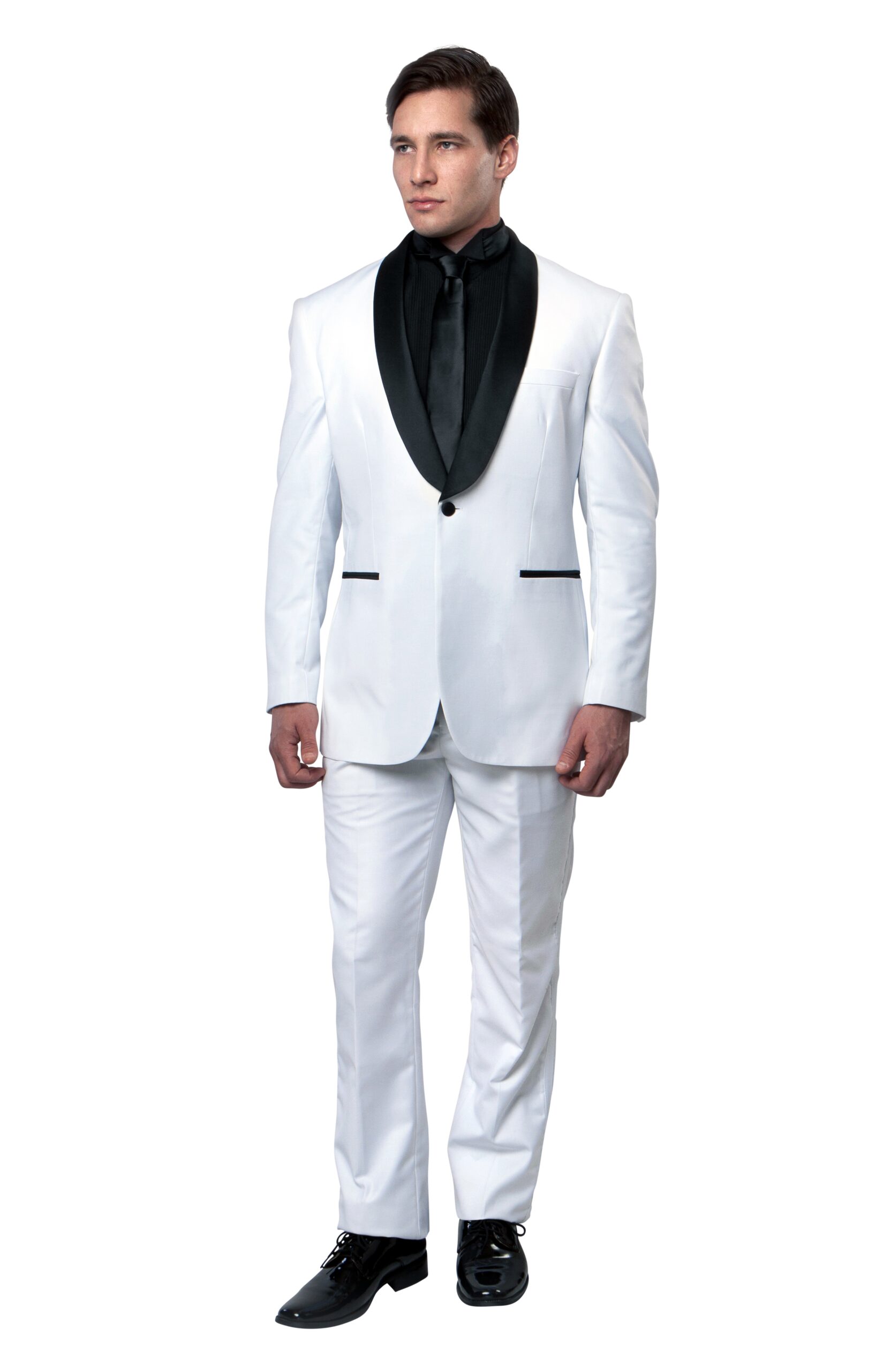 One Button White Tuxedo with Black Satin Shawl Collar