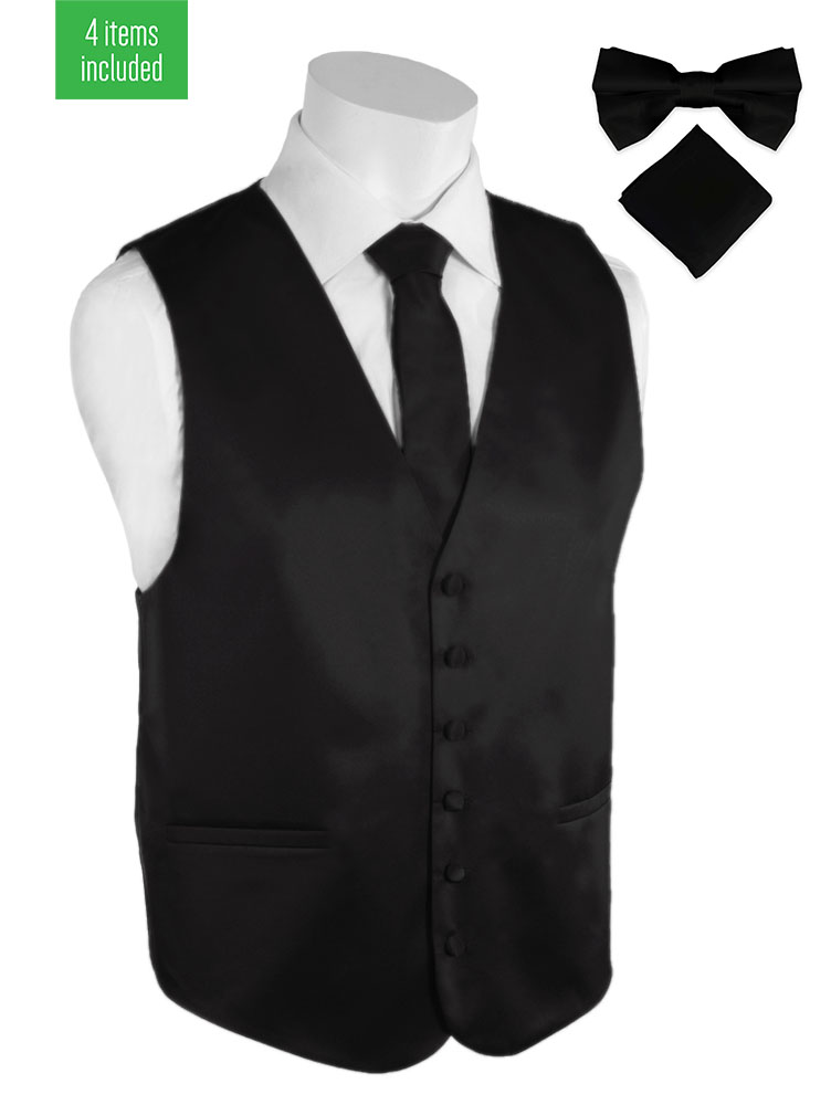 Have you spent hours finding the right pocket square or bowtie to match your suit? Well, this black tuxedo vest comes with a bowtie, tie and a pocket square. Wear the tie to the office or a more casual event and the bowtie to a black-tie event like a gala dinner.