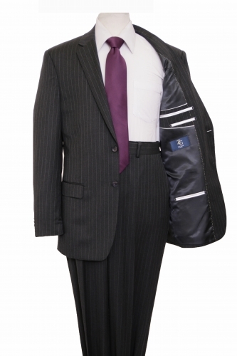 A pinstripe dark gray wool suit design that’s subtle and stylish