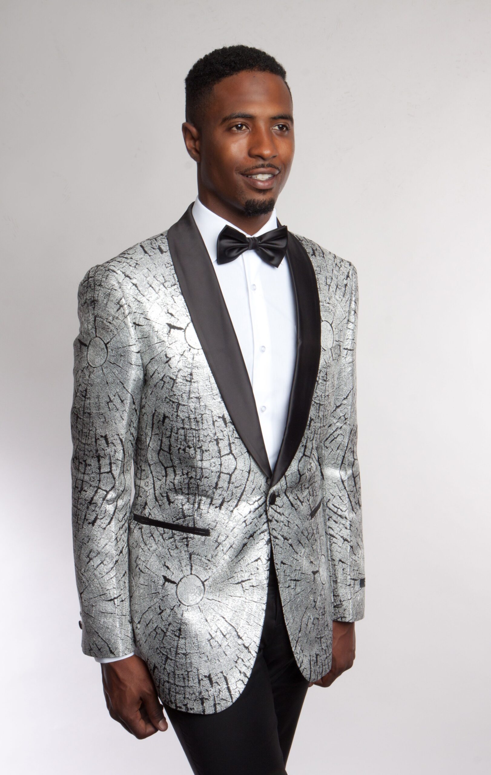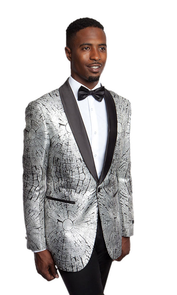 The silver and black one button modern fit jacket is a must wear to weddings, dinner, parties, and other celebrations. You will always be thankful for the extra boost of confidence you will get from wearing this elegant silver and black jacket.